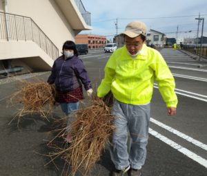 10月になっても日差しが強く暑い日が続いていました。春とは違った草が伸びていて、ひっつき虫(雑草の種子)まみれになりながら一生懸命草を集めてくれました。作業後はみんなで手分けして軍手や服に付いたひっつき虫をとりました。